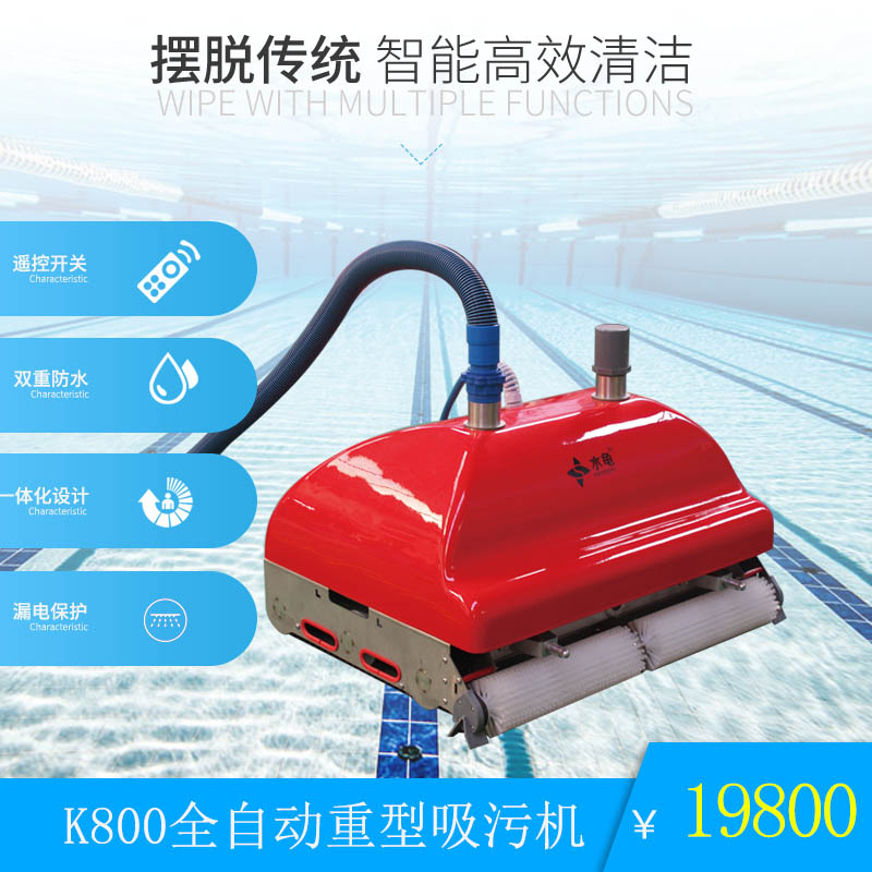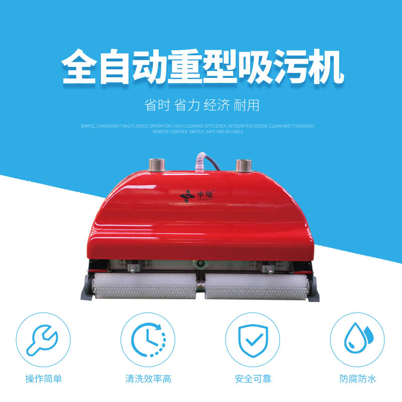 使用简单方便、采用坦克履带式行走机构、超强爬坡性能、可全自动或遥控工作、自带传感器、触壁自动掉头、逐行清理、电子防缠绕设计。双工模式,滤袋(10-100um)循环过滤和排水管直排。前置滚刷倍速刷洗清理更彻底、无盲区前置加大吸口轻松吸走沉淀、大物、树叶等、吸口后置橡胶刮板、对瓷砖、马赛克、塑胶膜、水泥池等更好的清理且不伤地面。对青苔、绿藻、絮凝物等彻底清除。